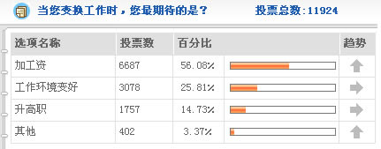 而56.08%的网友在工作变动时最期待加工资,25.81%的网友则希望工作环境变好,希望升职的网友仅仅占到14.73%。