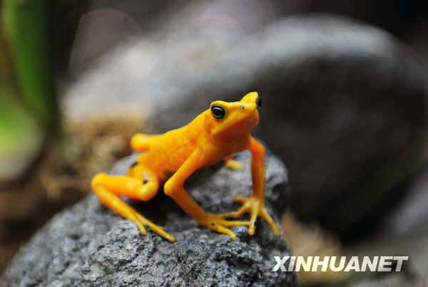 这是4月16日在巴拿马安东谷埃尔尼斯佩罗两栖动物保护中心拍摄的巴拿马金蛙。