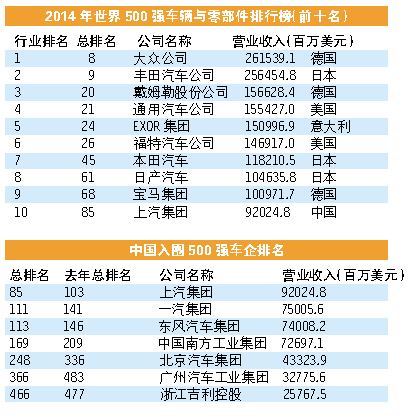 每年夏天,美国《财富》杂志都会发布世界500强排行榜,排名依据主要为企业年度营业收入。7月7日,2014年度《财富》世界500强排行榜发布,车辆与零部件共有33家公司入围。令人感到高兴的是,继2013年中国“七大金刚葫芦娃”上榜之后,今年同样有7个“葫芦娃”入围,分别为:上汽、一汽、东风、中国南方工业集团公司(长安)、北汽、广汽和吉利控股。