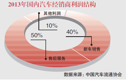 统计数据显示,2013年汽车经销商在营收方面新车销售占比达到86.74%,售后服务为9.78%。但在利润方面,售后服务占比却高达50%,而新车销售利润只占40%。电商涉及售后,正是看到了这块诱人的蛋糕。不过,很显然,此种模式的出现必然会涉及到4S店售后服务的利益。