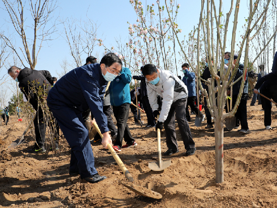 一大早,部长们佩戴口罩统一乘车到达植树现场,测量体温后直奔植树地点,自取植树用具,以1米间隔分散植树。扶正树苗、回填泥土、围堰浇水……经过一上午的劳动,共栽下油松、法桐、银杏、国槐、八棱海棠等树木2050株。