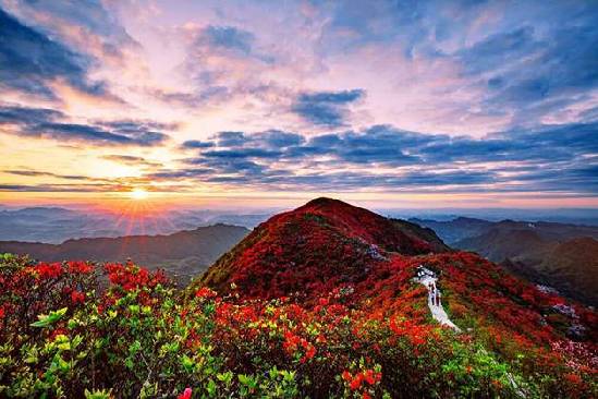 同样选择在薄雾初上的黎明出发,顺着龙泉山蜿蜒的石板路拾阶而上,途径一座古朴典雅的半山凉亭抵达山顶,眼前的奇观如画卷般徐徐展开:这是一片壮阔的云海,几处鲜艳的杜鹃花丛在云霞中若隐若现,云海下隐藏着一整片杜鹃花海,延绵好几公里,将龙泉山脉装点得一派火红,日出时东方天际喷涌而出的红霞映照着云海杜鹃,仿佛给空气镶上了红色滤镜,一时间群山都变得奇幻瑰丽,这是丹寨龙泉山别具一格的云上杜鹃花海——云海不稀奇,花海也常有,云上花海却是大多数人这辈子难得一见的奇观,想亲眼目睹吗?