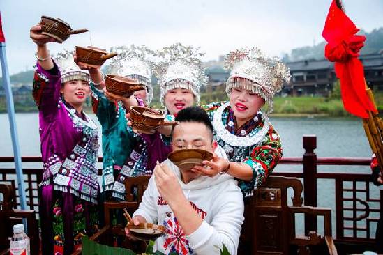 配合着各类美食,苗家春宴里不仅有十八道“拦门酒”、“高山流水”等花式敬酒,还有广场迎宾舞、苗族八大支系盛装巡游等多项苗、侗等少数民族的特色活动。其中最值得一提的,便是宴席开始前丹寨锦鸡舞的表演,在苗族传统芦笙伴奏下,身着银角冠服饰的苗族姑娘如锦鸡般翩翩起舞,银饰跃跃欲飞,银角冠一点一摇,腿边花带一飘一闪,舞者步履轻盈,悠然摇摆,欢乐的气氛让人胃口大开。